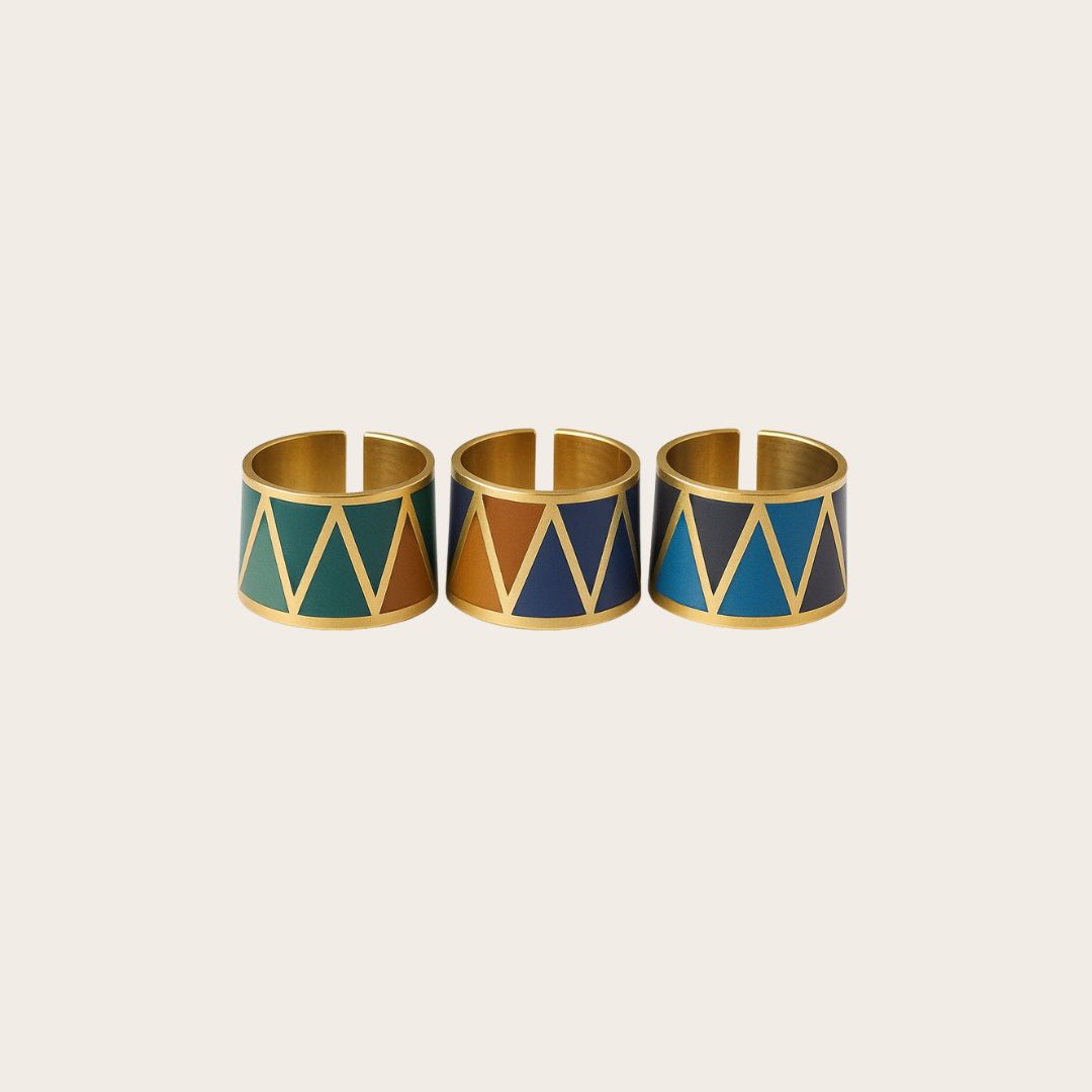 Hand-enameled in warm autumn shades and finished with a gold-plated brass base, this ring adds personality to any look — from casual daytime outfits to chic night events.